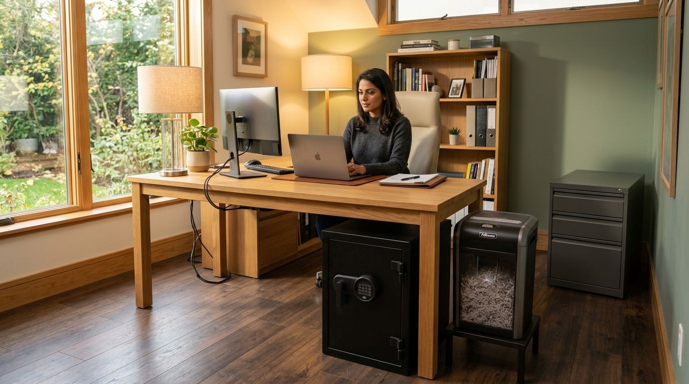Your documents live two lives. The originals sit behind a steel door and a code you chose. The copies go through a shredder and come out as particles too small to read. Both halves of that cycle come from one product line.